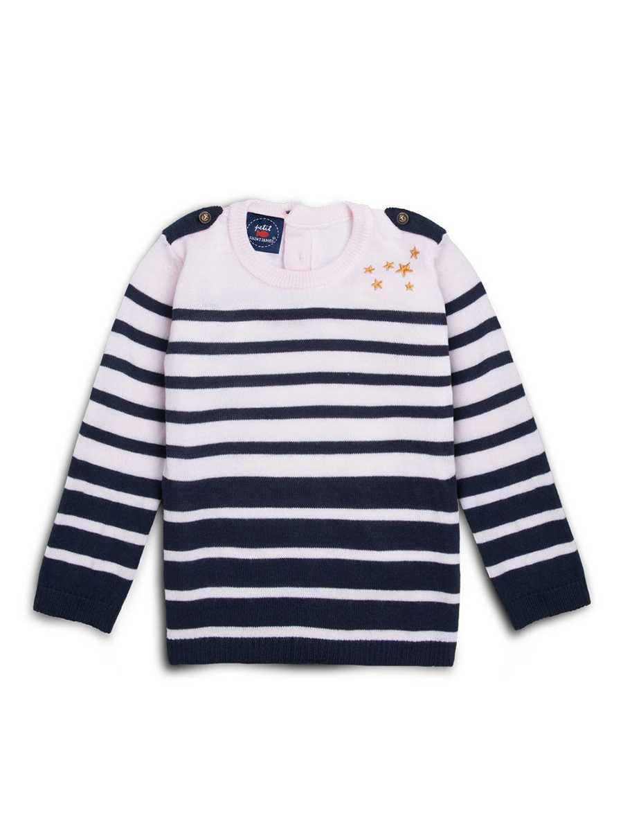 Paw print detail on shoulders with anchor buttons. Interplay of stripes on body of garment and on sleeves. Embroidered stars on upper section of sweater.